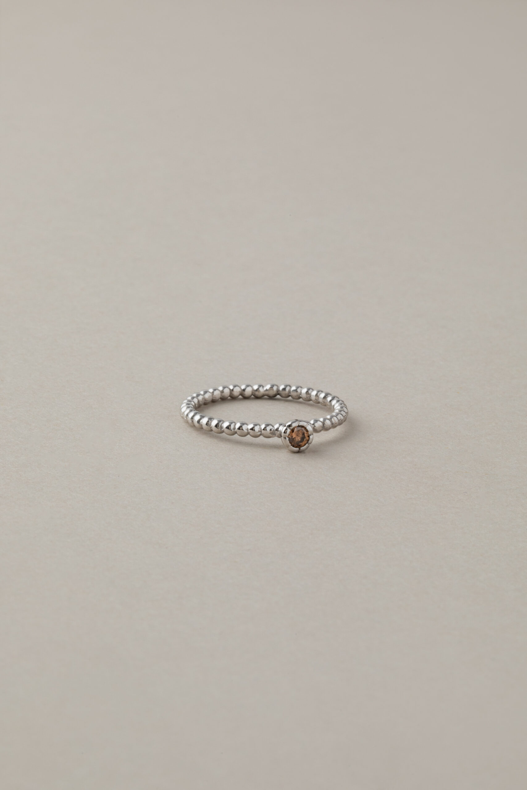 Centralnym punktem pierścionka jest ręcznie oprawiony brylant, który przyciąga wzrok swoim blaskiem i elegancją. W wersji z białego złota kompozycja zyskuje nowoczesny, chłodny ton, idealnie współgrający z niezwykłym odcieniem brązowego brylantu. Ten rzadziej spotykany kolor kamienia dodaje całości oryginalności i ciepła, tworząc harmonijne połączenie klasyki z nutą nieoczywistego piękna