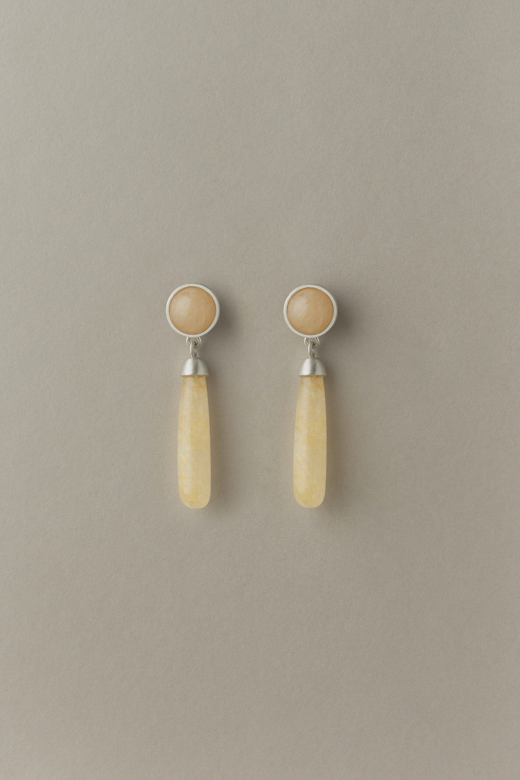wykonane ręcznie eleganckie kolczyki składające się z dwóch segmentów – oczka wypełnionego awenturynem w kolorze masełka i sopla oszlifowanego w unikatowy opływowy kształt zgodnie z autorskim zamysłem